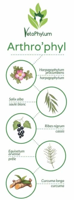 Arthro’phyl : 100 mg/gélule d’extrait d’Harpagophytum, 100 mg/ gélule d’extrait de saule blanc. Poudres, de cassis, de prêle et de curcuma.
