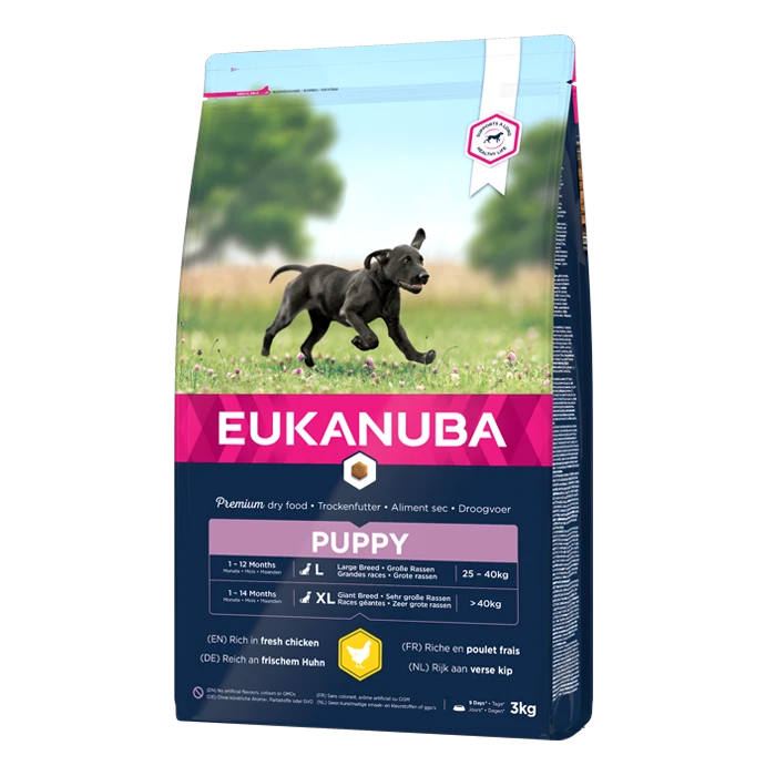 Riches en poulet frais, les croquettes Eukanuba sont idéales pour les chiots de grandes races âgés de 1 à 12 mois (ou de 1 à 14 mois pour races géantes). Les ingrédients sélectionnés offrent une alimentation parfaitement adaptée à la croissance et au développement de votre animal. Les croquettes Eukanuba contiennent du DHA pour stimuler l’apprentissage et l’intelligence des chiots, ainsi que du calcium pour le bon développement des os. Le mélange de fibres sur mesure, composé de prébiotiques FOS, MOS et de pulpe de betterave, favorise une digestion saine. Les croquettes Eukanuba renforcent par ailleurs la santé de la peau et la brillance du pelage, grâce aux sources naturelles d’oméga 6 et d’oméga 3. De plus, les croquettes Eukanuba de forme hexagonales, associées à la technologie DentaDefense, contribuent à la bonne hygiène bucco-dentaire à long terme. Cette recette est 100 % complète et équilibrée. Une alimentation de haute qualité adaptée aux chiots de grandes races assure à votre compagnon une condition physique optimale et une vie en pleine santé.