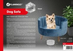 Un sofa pour chien doté de quatres pieds dorés qui lui donne un look très chic. Il est recouvert d’un tissu en velours bleu pétrole.