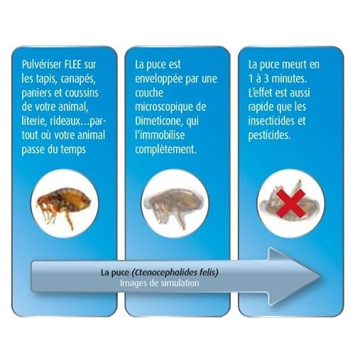 Les oeufs, larves et puces se trouvent détruits entre 1 et 3 minutes par Flee qui les immobilise dans une enveloppe collante de diméticone.