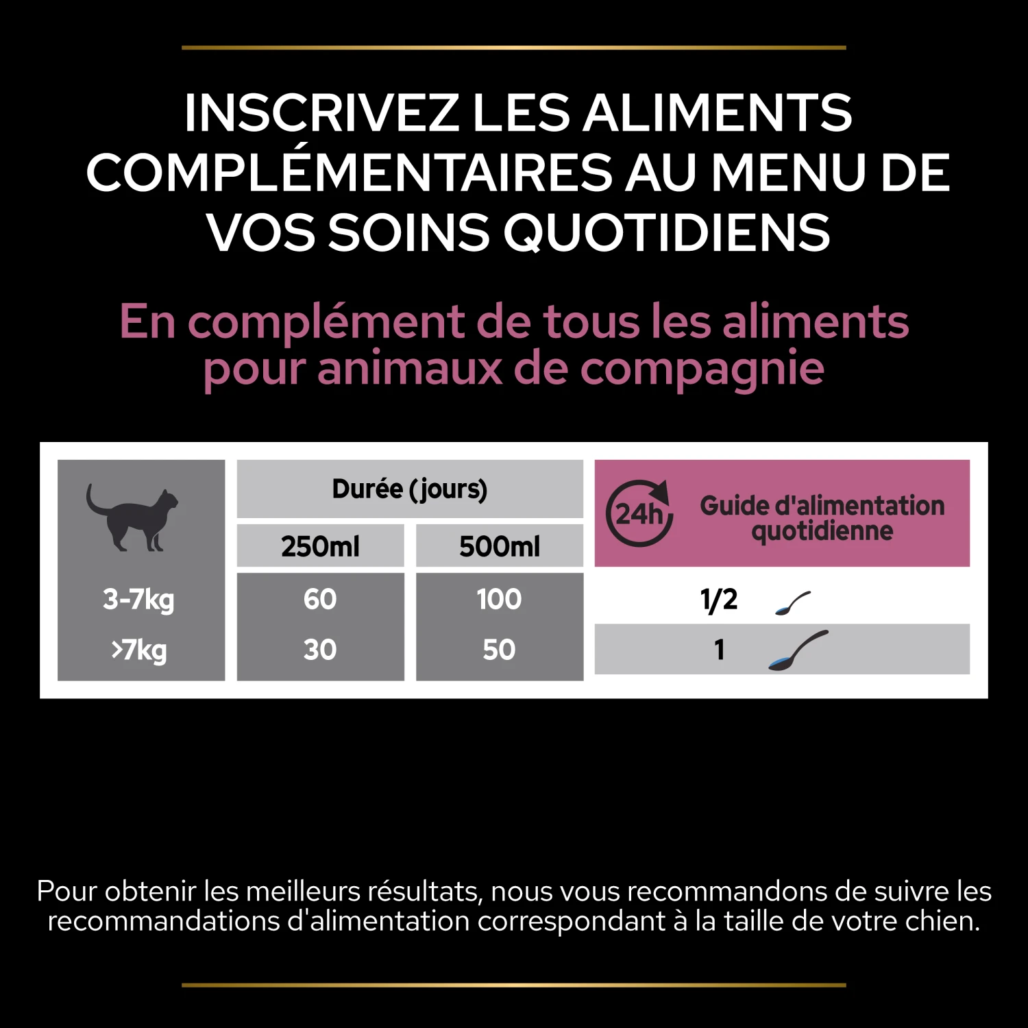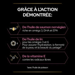PRO PLAN® a mis au point une gamme d’aliments complĂ©mentaires ciblĂ©s destinĂ©s Ă agir sur la mobilitĂ©, l’immunitĂ©, la vitalitĂ©, la digestion, la peau & le pelage et le bien-ĂŞtre. PRO PLAN® Skin & Coat+ nourrit la peau et le pelage de votre chat de l’intĂ©rieur, grâce Ă sa formule riche en nutriments essentiels (tels que les acides gras OmĂ©ga 3 et 6 issus d’huile de saumon de Norvège, l’huile de lin et la vitamine E). Sa formule est scientifiquement conçu pour : – Soutenir une peau saine, hydratĂ©e et souple et un pelage brillant