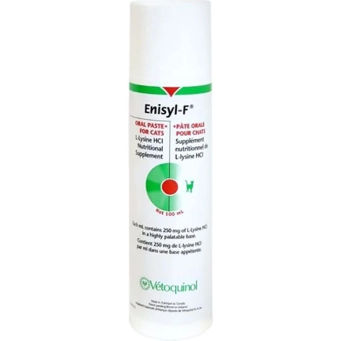 Enisyl-F aide à réduire l’excrétion du virus HVF-1 et contribue à atténuer les signes cliniques et la fréquence des poussées actives d’HFV-1. L’infection par l’herpès virus félin de type 1 se traduit par un complexe clinique associant rhinite et conjonctivite. Plus de 80 % des chats infectés restent porteurs de l’Herpès virus félin après une primo-infection. Il persiste à l’état latent au sein du système nerveux, en particulier au sein des ganglions tri-jumeaux. Une réactivation est possible en cas de stress (mise bas, lactation, corticothérapie) et se traduit par la réapparition des symptômes et une excrétion du virus. La L-Lysine entre en compétition avec l’arginine, acide aminé indispensable à la réplication du virus HVF-1 et participe ainsi au blocage de sa réplication.