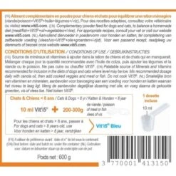 Vit’i5 ORANGE est formulĂ© spĂ©cifiquement pour Ă©quilibrer en minĂ©raux, vitamines et oligo-Ă©lĂ©ments l’alimentation mĂ©nagère des chiens et chats = viande/poisson + Vit’i5 ORANGE + huile de colza + lĂ©gumes +/- fĂ©culent.